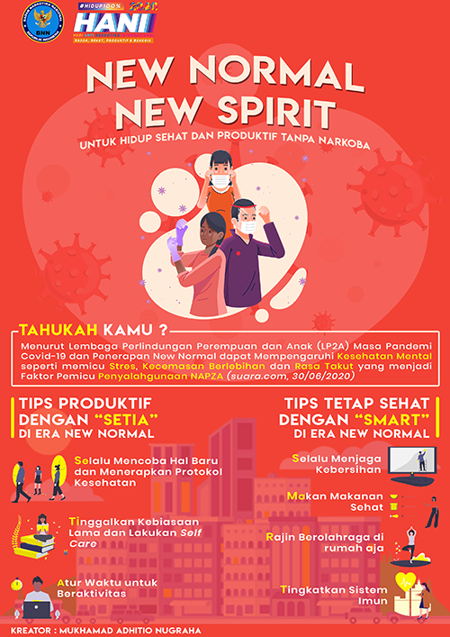 Adhitio Nugraha adalah salah satu kontributor lomba poster BNN Kota Jakarta Timur, poster ini memberikan informasi lengkap dan jelas, warna yang digunakan juga penempatan tulisan dan materi sagat menarik, semangat New Normal New Spirit sangat baik untuk kalangan anak muda, agar selalu kreatif dan produkstif. BNN Kota Jakarta Timur memberikan apresiasi ntuk generasi muda, cerdas dan kreatif.
